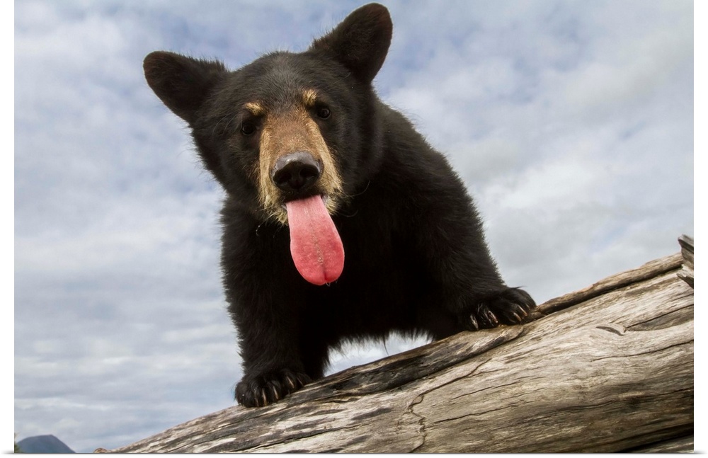 <p>Black bear cub (ursus americanus) with its tongue out, captive in Alaska Wildlife Conservation Center, South-central Alaska, Portage, Alaska, United States of America.</p>