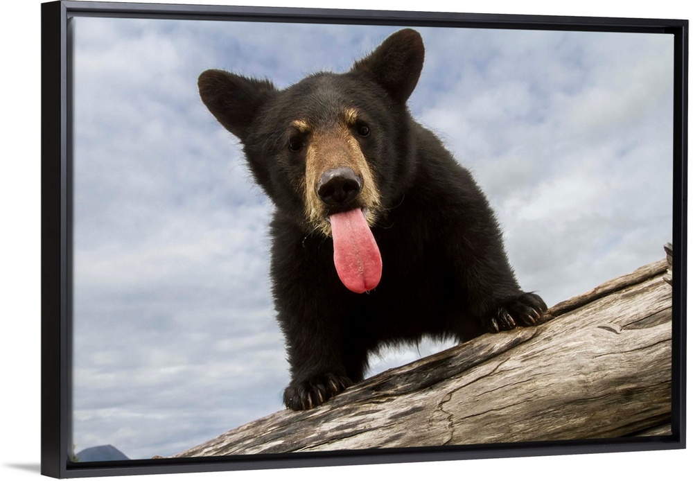 <p>Black bear cub (ursus americanus) with its tongue out, captive in Alaska Wildlife Conservation Center, South-central Alaska, Portage, Alaska, United States of America.</p>