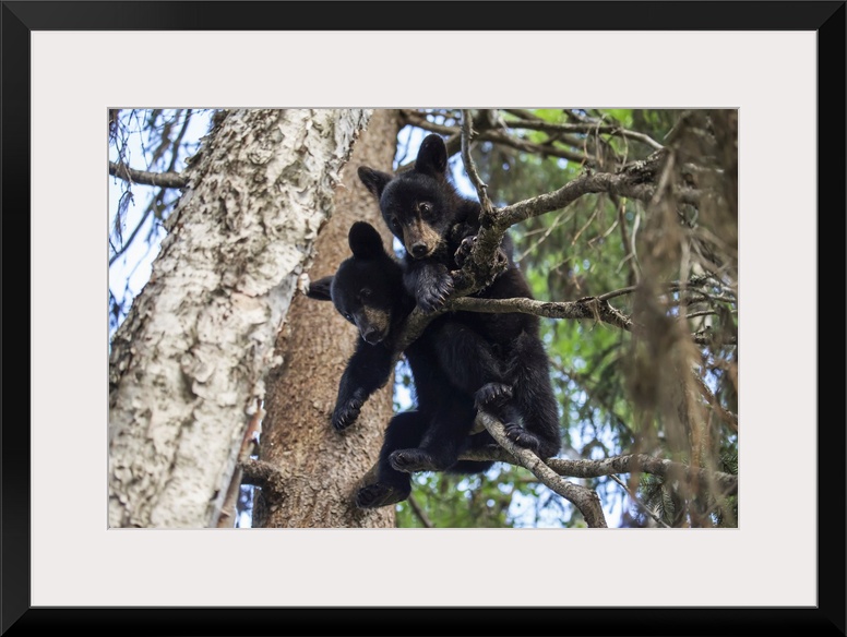 <p>Black bear (ursus americanus) cubs playing on the tree branches, south-central Alaska, Alaska, united states of America.</p>