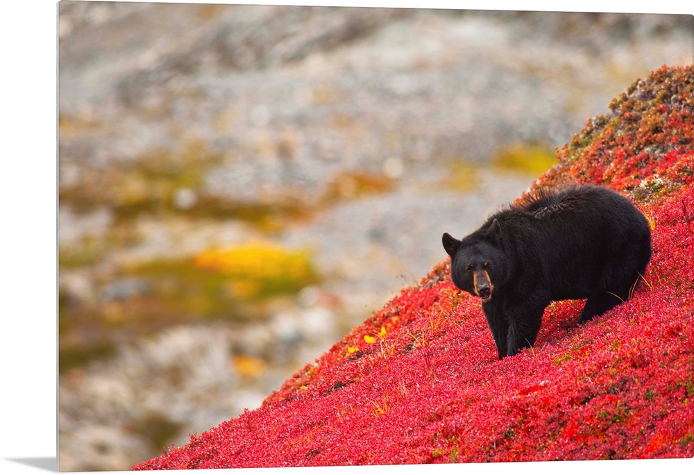 <p>A black bear foraging for berries on a bright red patch of tundra on a fall day near the Harding Icefield Trail at Exit Glacier in Kenai Fjords National Park near Seward, Alaska</p>