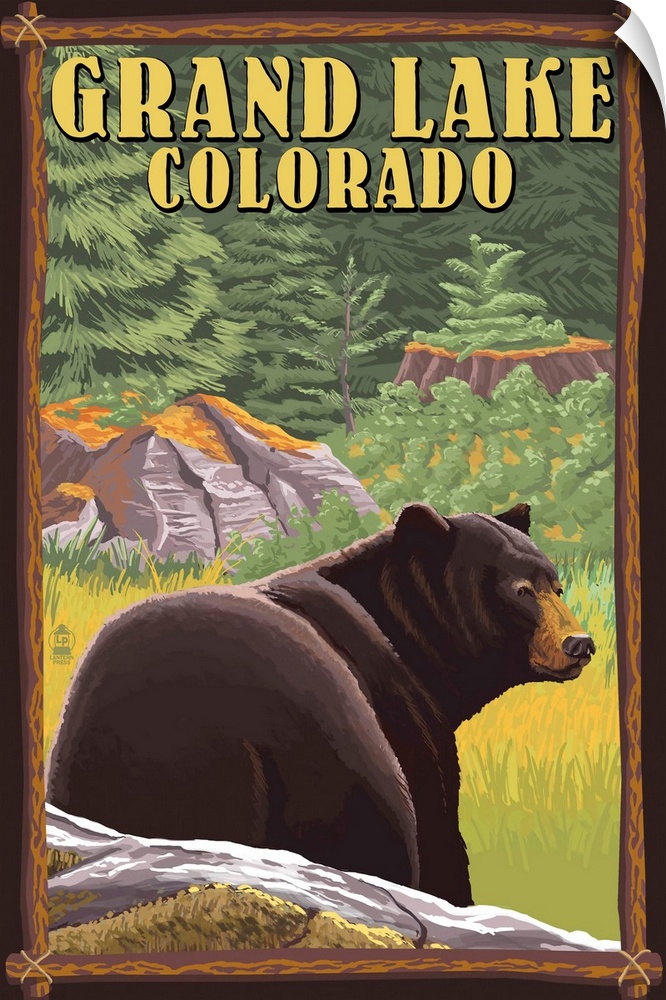 <p>Retro stylized art poster of an adult black bear standing in a clearing of a pine forest with tree stumps.</p>