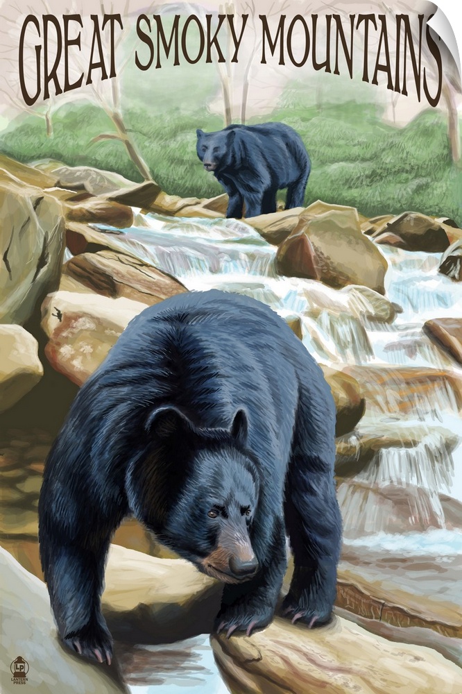 <p>Retro stylized art poster of two black bears climbing over rocks in a stream in the forest.</p>