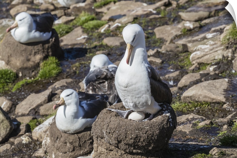 <p>Black-browed albatross (Thalassarche melanophris) on egg in breeding colony on Saunders Island, Falkland Islands, South America</p>