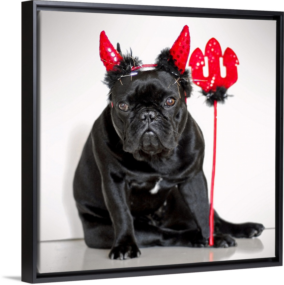 <p>French bulldog for Halloween party against white wall, Valencia.</p>