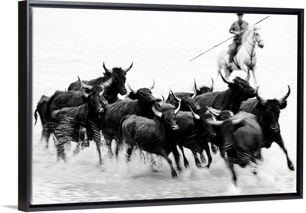 <p>Black bulls of Camargue and their herder running through the water, Camargue, France</p>