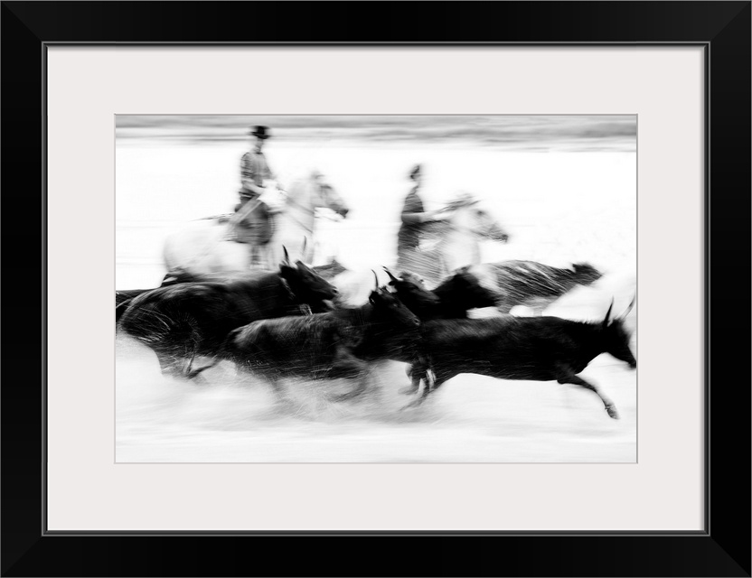 <p>Black bulls of Camargue and their herders running through the water, Camargue, France</p>