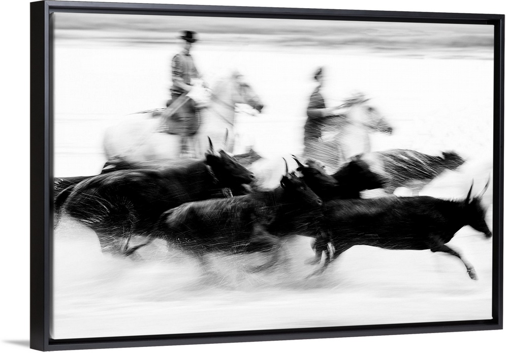 <p>Black bulls of Camargue and their herders running through the water, Camargue, France</p>
