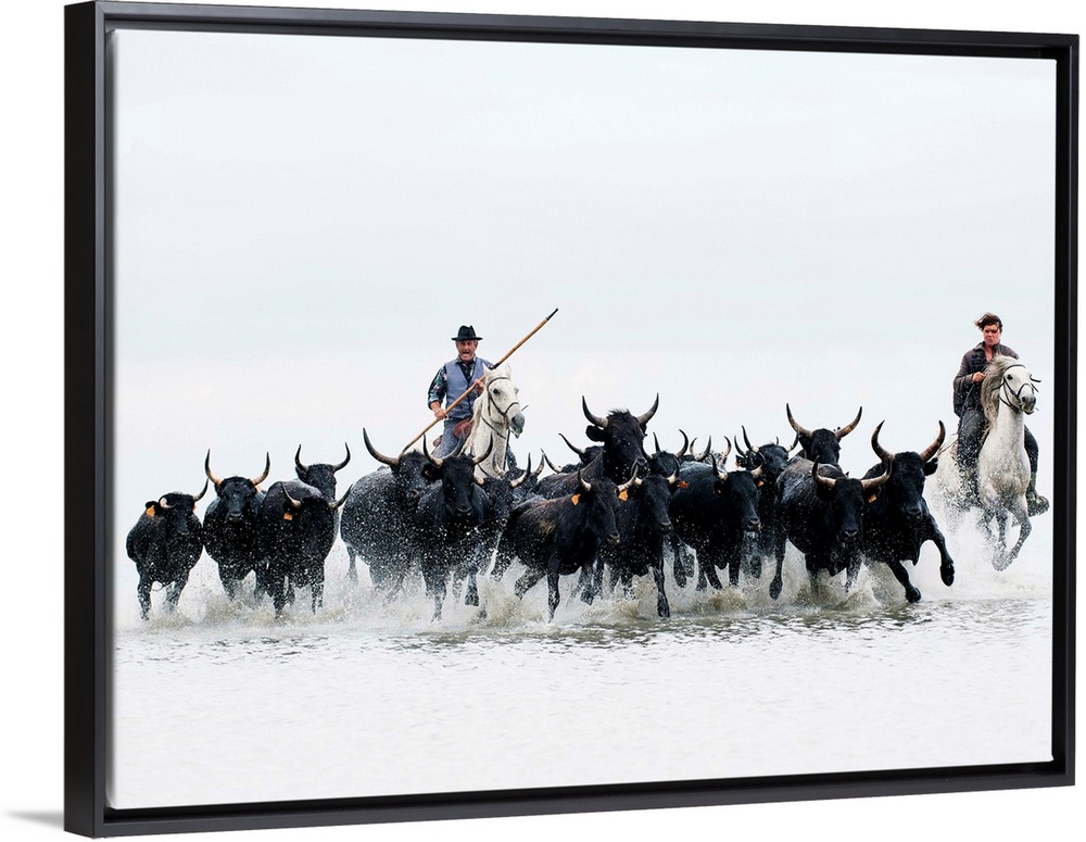 <p>Black bulls of Camargue and their herders running through the water, Camargue, France</p>