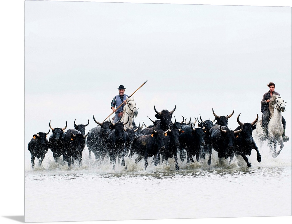 <p>Black bulls of Camargue and their herders running through the water, Camargue, France</p>