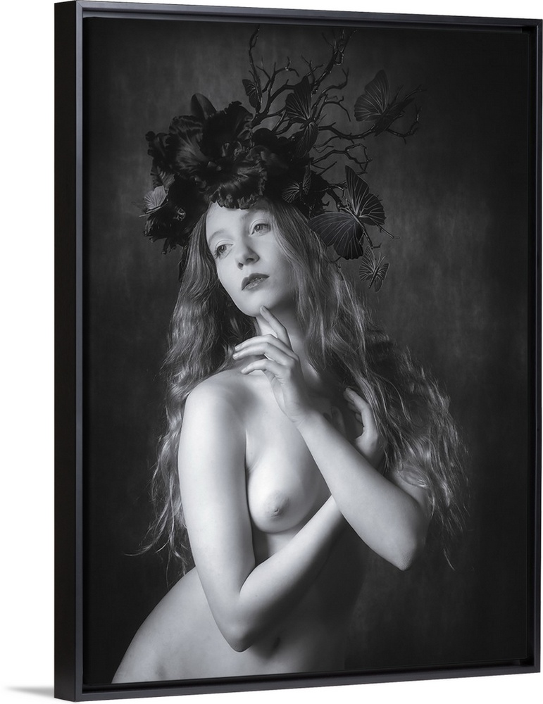 <p>Black and white fine art portrait of a nude woman wearing a floral and butterfly headpiece.</p>