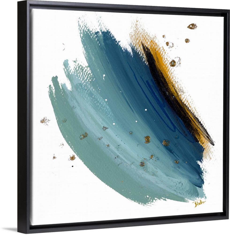<p>Abstract artwork featuring thick brush strokes in shades of blue with gold color splatters and speckles throughout.</p>