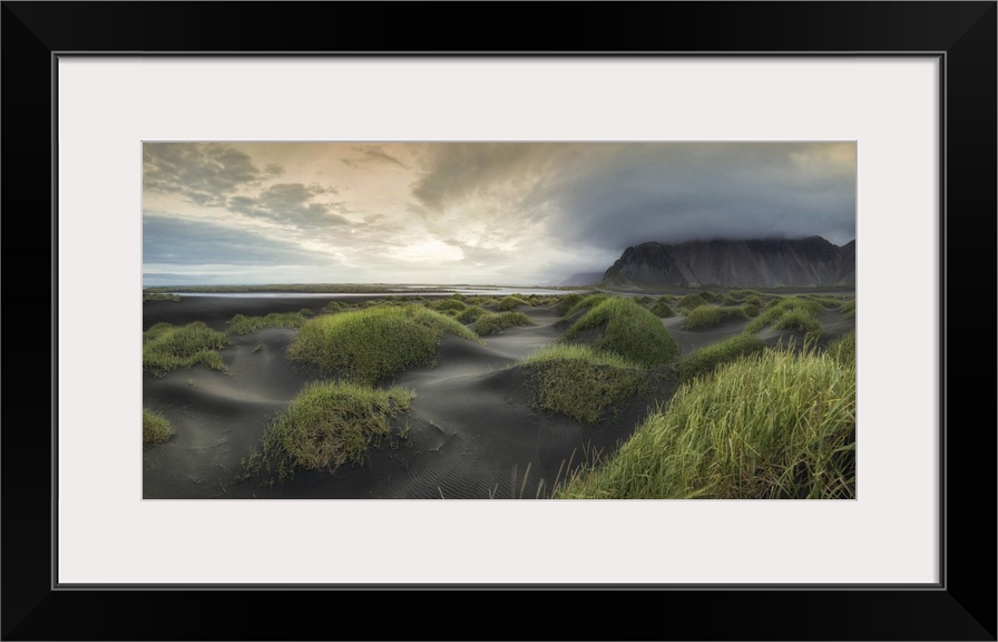 <p>Stormy clouds gather over tranquil dunes in this beach landscape photograph.</p>