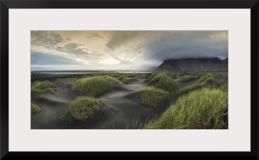 <p>Stormy clouds gather over tranquil dunes in this beach landscape photograph.</p>