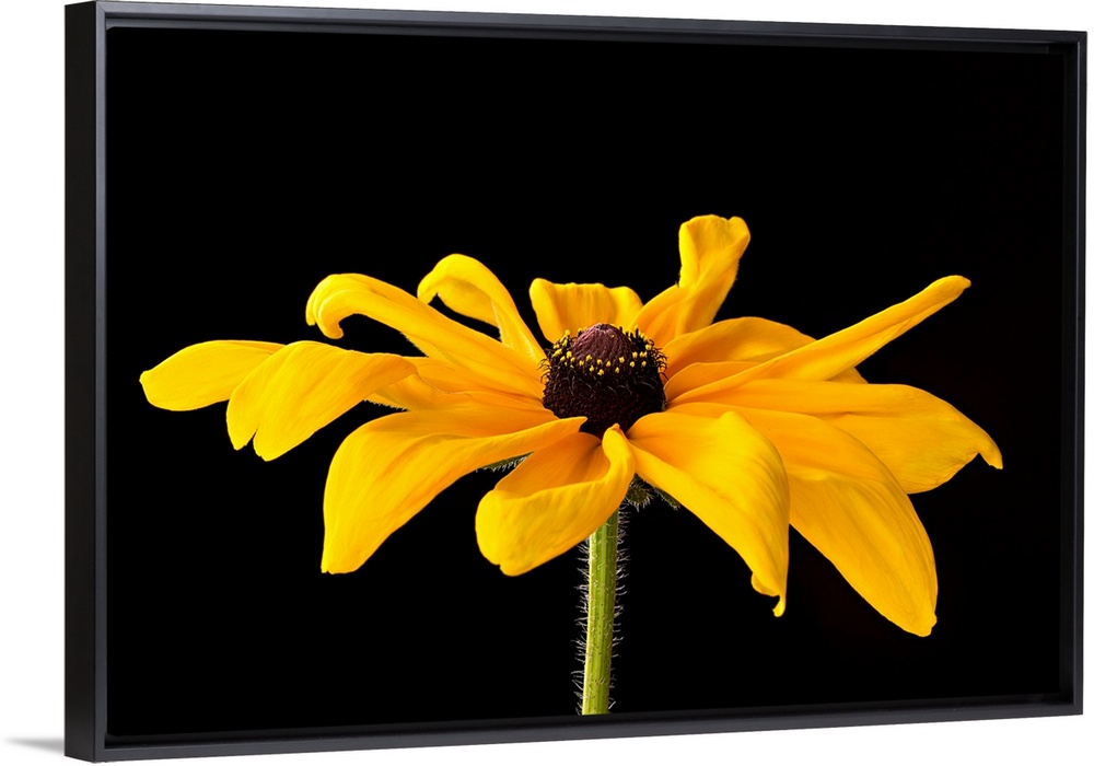 <p>Photograph of a large yellow black eyed susan bloom on a black background.</p>