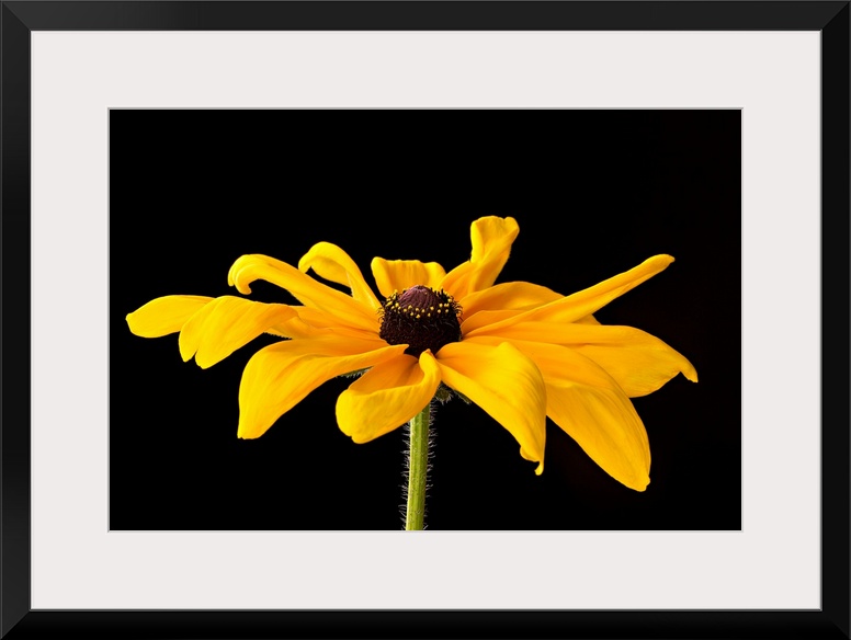 <p>Photograph of a large yellow black eyed susan bloom on a black background.</p>
