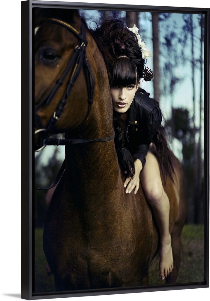 <p>Young woman with black hair sitting bare back on horse leaning forward towards the camera</p>