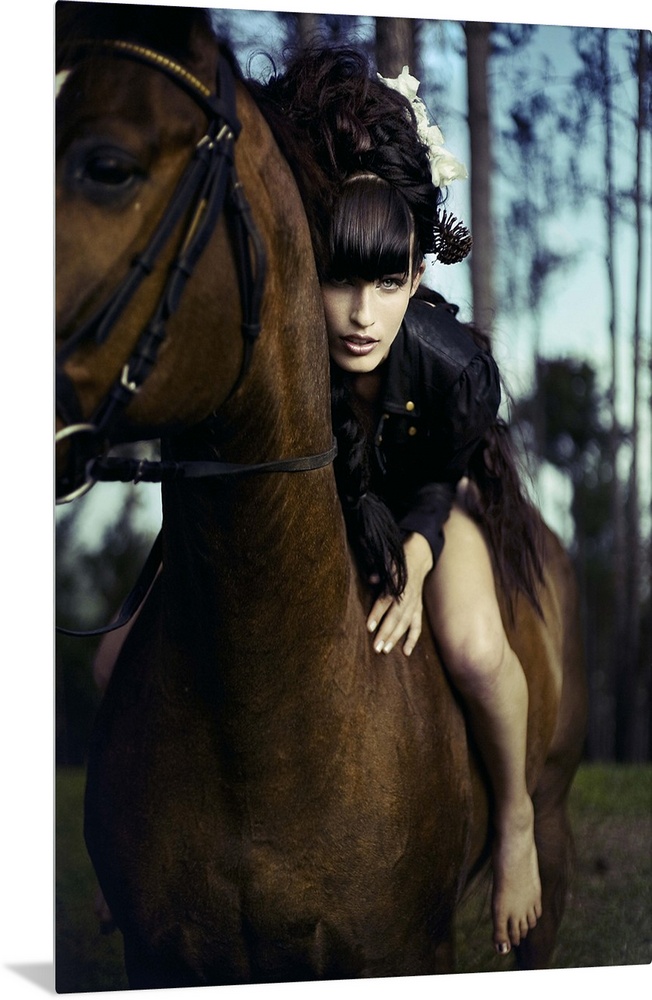 <p>Young woman with black hair sitting bare back on horse leaning forward towards the camera</p>