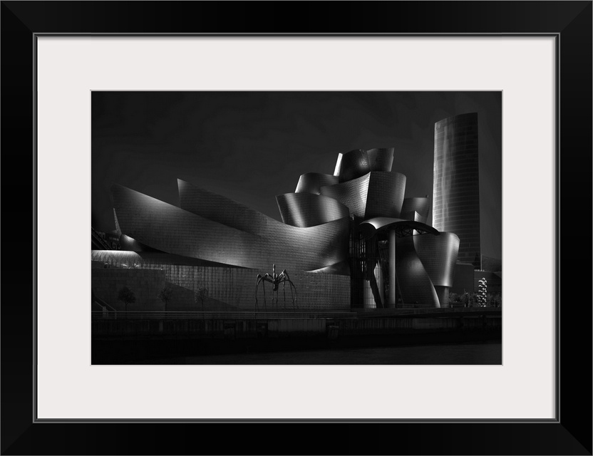 <p>Black and white image of the interesting architecture of the Guggenheim museum in Bilbao, Spain.</p>