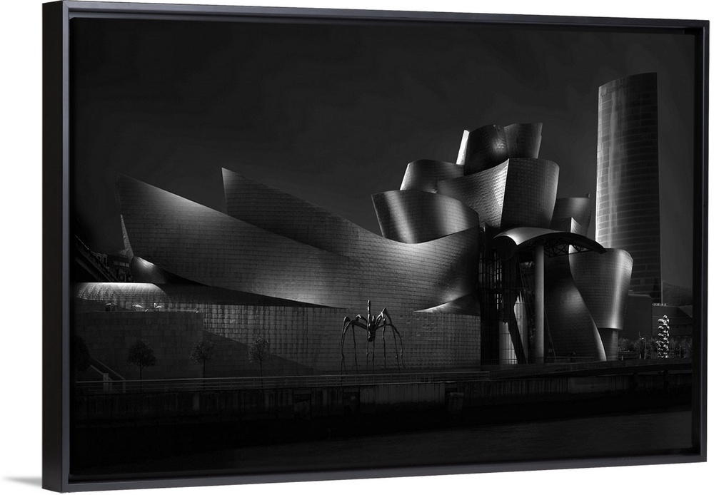 <p>Black and white image of the interesting architecture of the Guggenheim museum in Bilbao, Spain.</p>