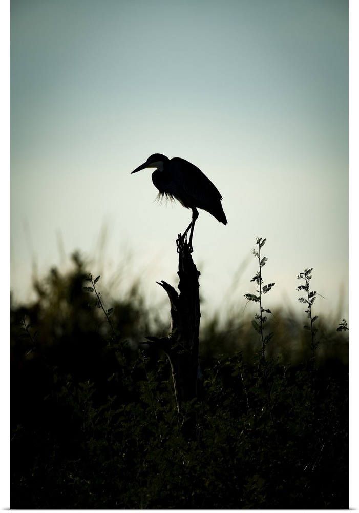<p>Black-headed heron (Ardea melanocephala) stands on stump in silhouette, Serengeti; Tanzania</p>