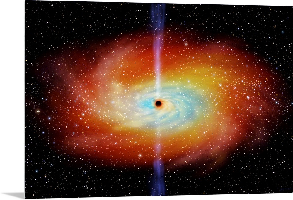 <p>Black hole. Computer artwork of a black hole and a surrounding accretion disc (red and blue) of material spiralling into the black hole. A black hole is formed when the core of a star collapses under its own weight, increasing its gravitational field to the point where, beyond a boundary known as the event horizon, nothing, not even light, can escape. This leads to its black appearance. Only sufficiently massive stars form black holes, doing so when they have used up the fuel that sustained their nuclear fires. This results in a loss of outwards heat pressure, allowing the total collapse that forms the black hole.</p>