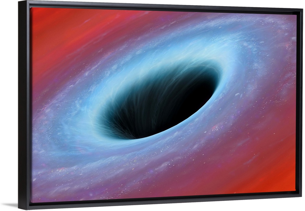 <p>A black hole is an object so compact (usually a collapsed star) that nothing can escape its gravitational pull. Not even light. The escape velocity of a black hole exceeds the speed of light. Since nothing can travel faster than this ultimate speed, black holes suck in everything including light, which makes them utterly dark and invisible. In this image, we can see a black hole, but only because it is surrounded by a superheated disc of material, an accretion disc. The closer to the hole the material gets, the more of its light is captured, which is why the hole grows darker towards its centre.</p>