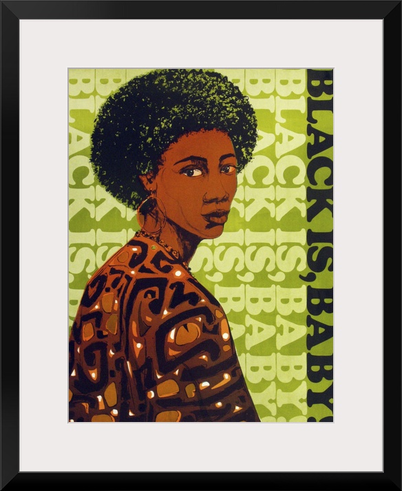 <p>Vintage poster artwork of an African-American woman looking over her shoulder with lime green text in the background.</p>