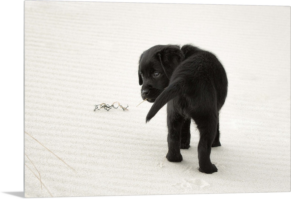 <p>8 week old, black labrador retriever puppy on a white sand beach looking over her shoulder back towards the camera with a blade of beach grass in her mouth</p>