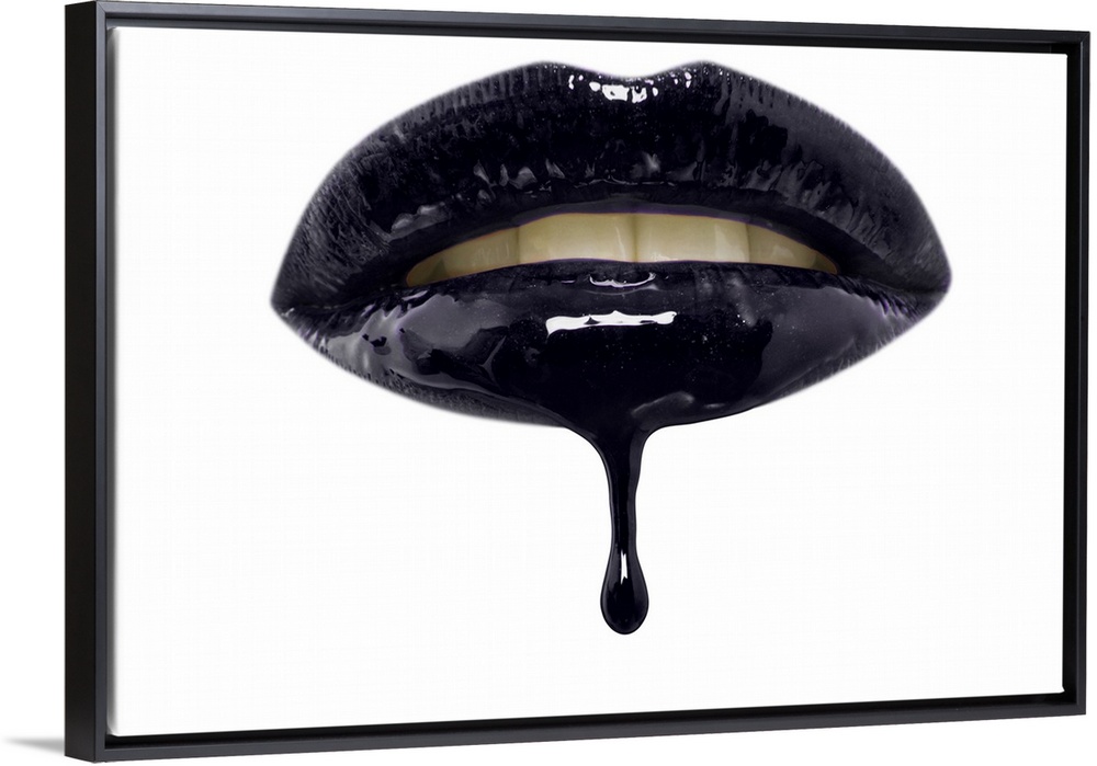 <p>Close-up of black lip-gloss dripping from woman's lips over a white background.</p>