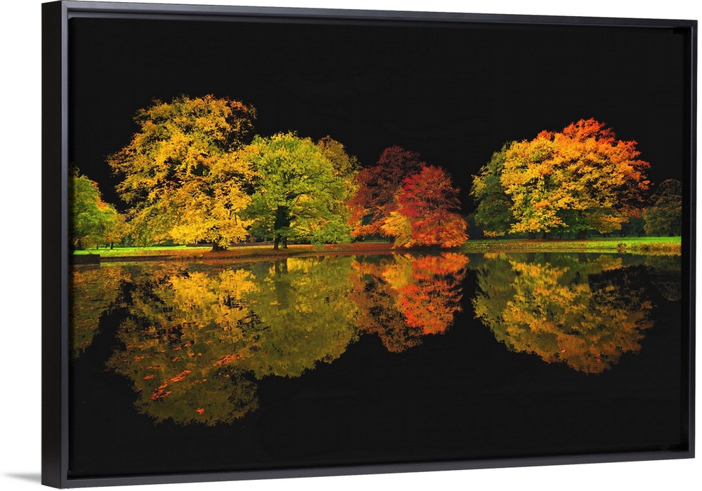 <p>Autumn trees lining a lake and reflecting into the water, with a dark black sky.</p>