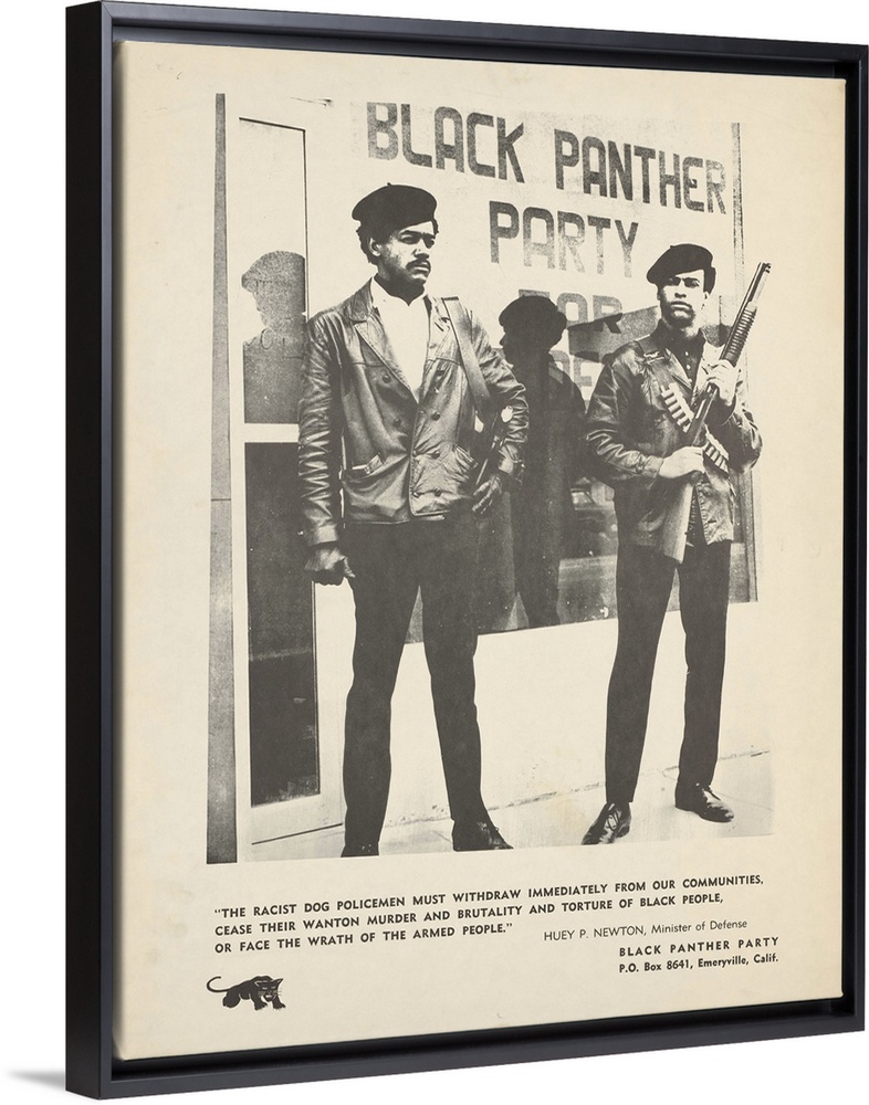 <p>Framed black and white poster of Huey Newton and Bobby Seale in front of the storefront headquarters of the Black Panther Party in Oakland, California. Both men are wearing berets and leather jackets and are armed with assault rifles. Below the image is this quote from Newton: "The racist dog policemen must withdraw immediately from our communities, cease their wanton murder and brutality and torture of black people, or face the wrath of the armed people."</p>
