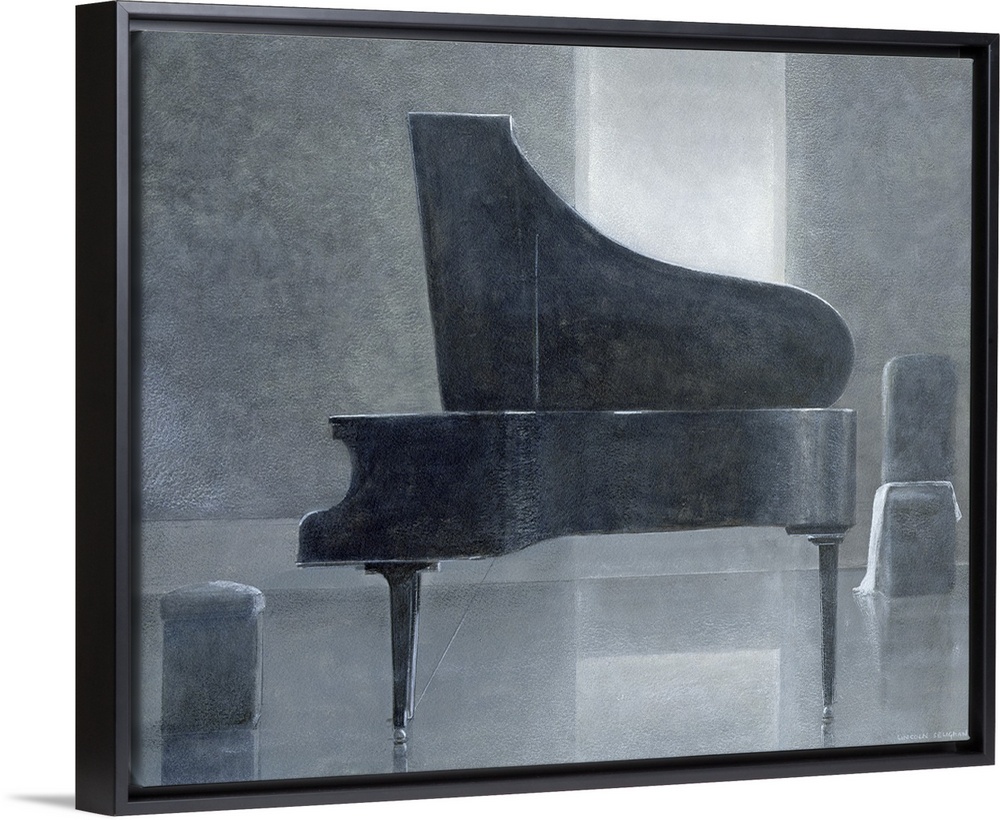 <p>This piece of contemporary artwork shows a grand piano from the side sitting in an almost bare room.</p>