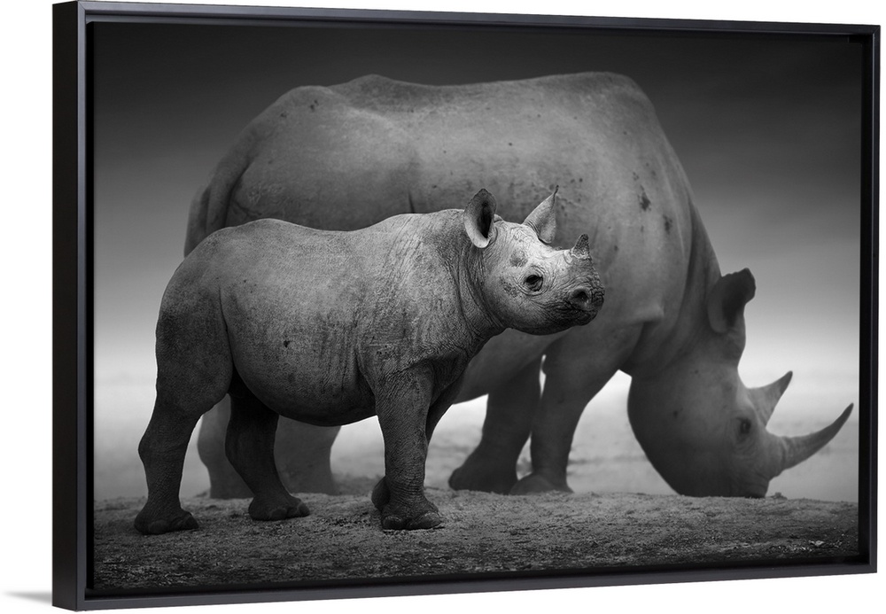 <p>Black rhinoceros calf (Diceros Bicornis) standing with cow at a waterhole. Etosha national park (digitally enhanced).</p>