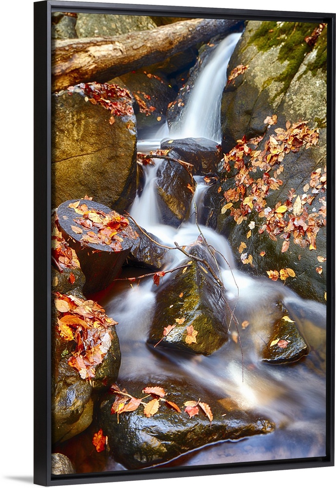 <p>Water cascading over rocks covered in fallen autumn leaves.</p>