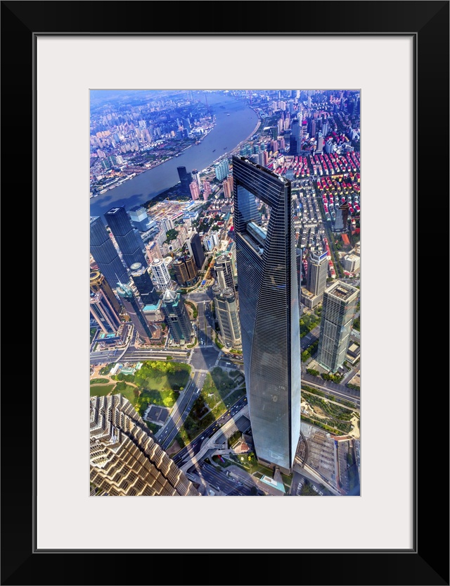 <p>Looking Down on Black Shanghai World Financial Center Skyscraper Reflections Huangpu River Cityscape Liujiashui Financial District Shanghai China.</p>
