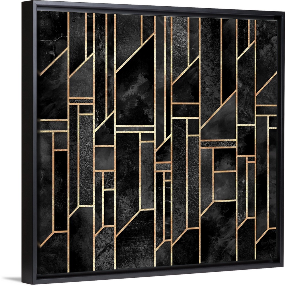 <p>A contemporary, geometric, art deco design in dark shades of grey and black. The shapes are outlined in gold.</p>