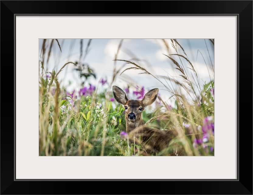 <p>A Black-tailed deer (Odocoileus hemionus) finds concealment in tall grass at Cape Disappointment State Park; Ilwaco, Washington, United States of America</p>
