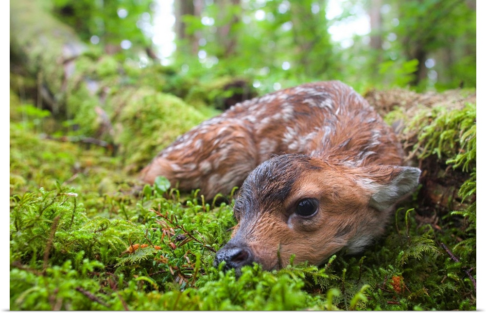 <p>Black-tailed deer (Odocoileus hemionus sitkaensis), newborn fawn lying in moss covered rainforest, Montague Island, Prince William Sound, Alaska, southcentral, summer</p>