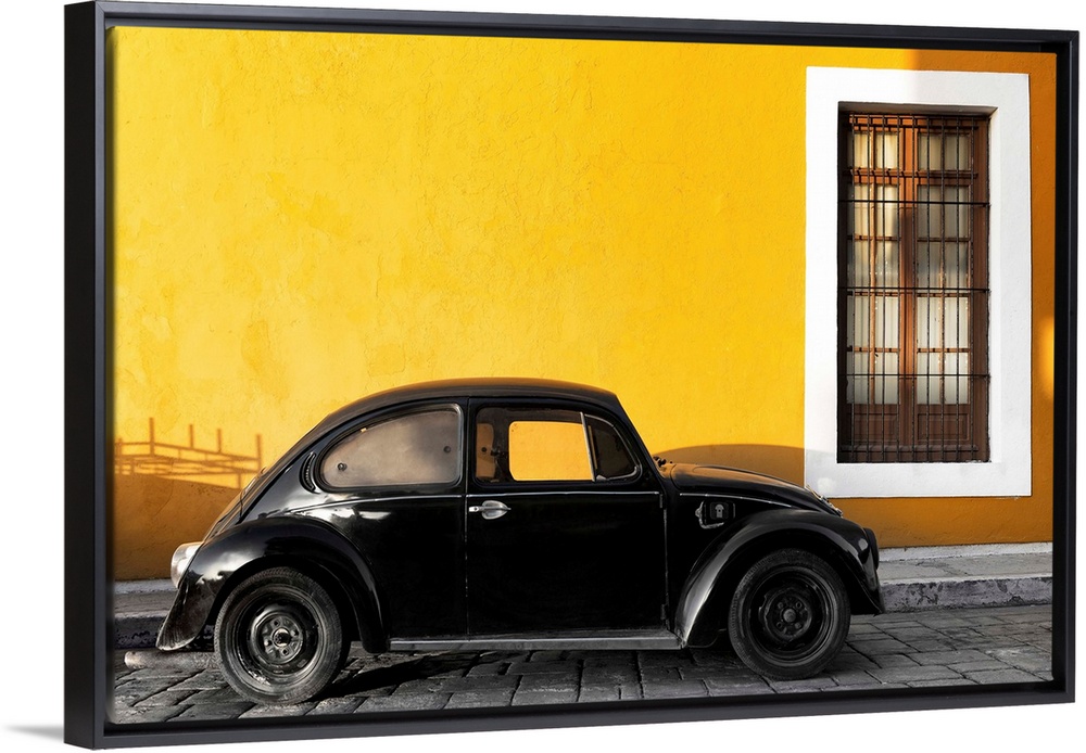 <p>Photograph of a black Volkswagen Beetle parked on the street in front of a gold exterior wall. From the Viva Mexico Collection.</p>
