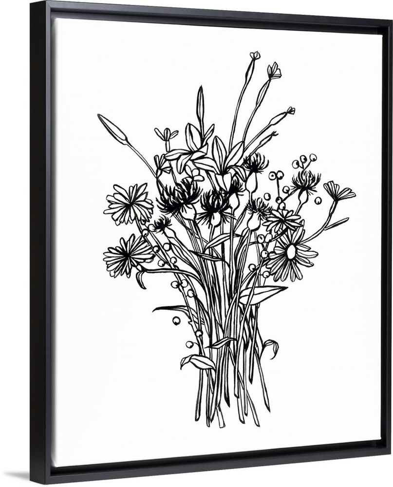<p>Contemporary painting of a floral bouquet outlined in black on a white background.</p>