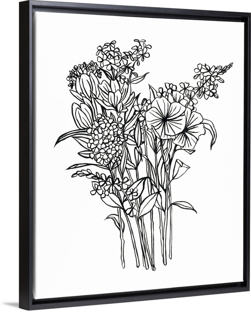 <p>Contemporary painting of a floral bouquet outlined in black on a white background.</p>