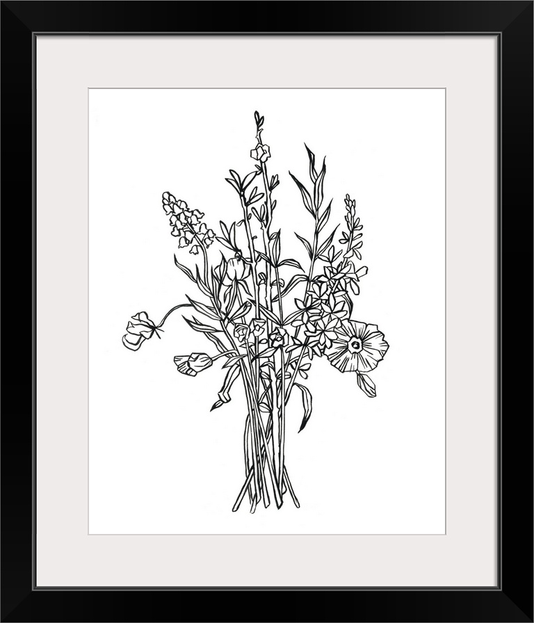 <p>Contemporary painting of a floral bouquet outlined in black on a white background.</p>