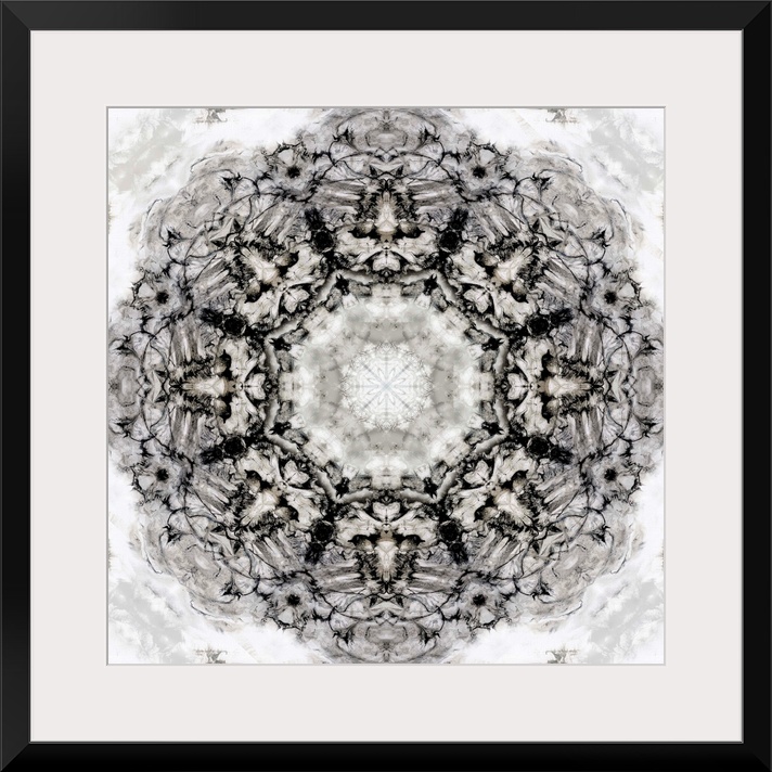 <p>Square abstract art in black and white hues with kaleidoscope-like patterns and designs.</p>