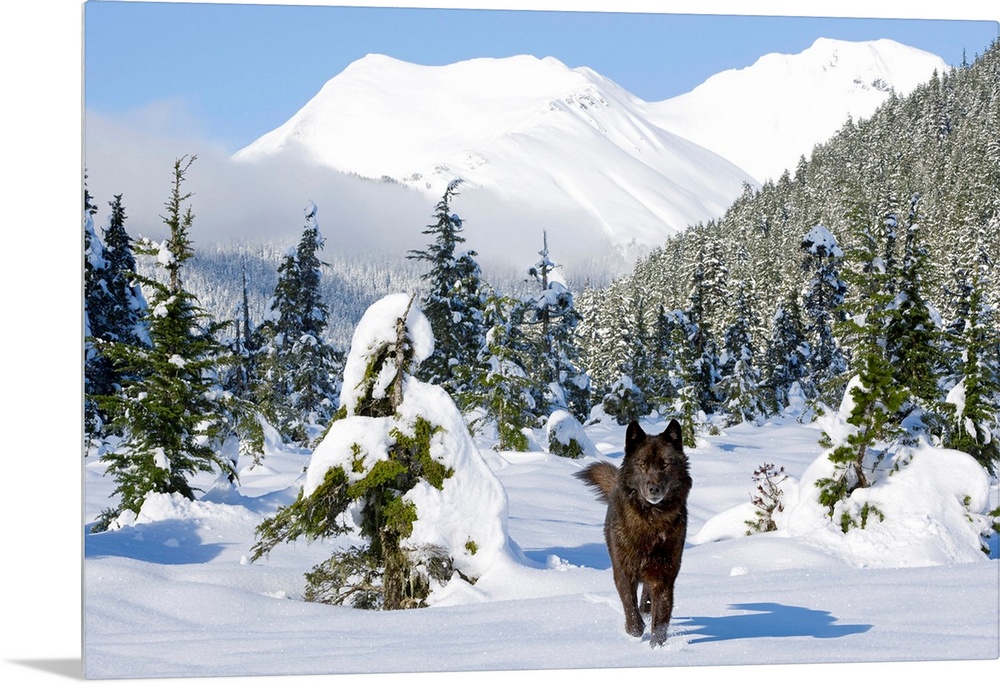 <p>Photograph shows a wild carnivorous mammal of the dog family making its way out of a forest littered with an abundance of trees. The entire mountain landscape can be seen blanketed in fresh snow.</p>