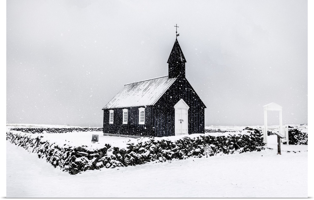 <p>The famous black wooden church at Budir in a winter blizzard, Snaefellsnes Peninsula, West Iceland.</p>