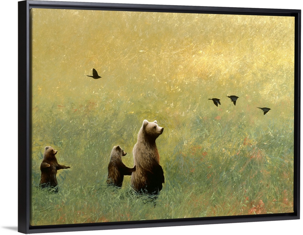 <p>Contemporary painting of three brown bears in a grassy field with black birds flying above.</p>
