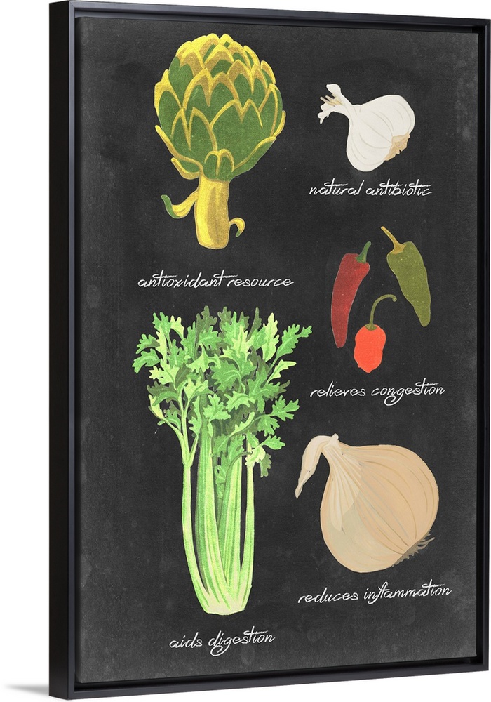<p>Contemporary artwork of vegetables and their names written underneath them in a chalkboard style.</p>