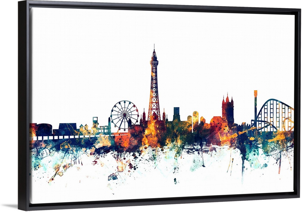 <p>Dark watercolor silhouette of the Blackpool city skyline against a light blue background.</p>