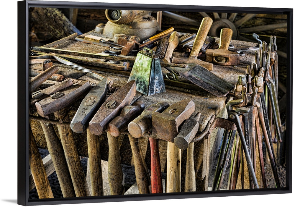 <p>An assortment of different hammers and tools in a blacksmith's workshop.</p>