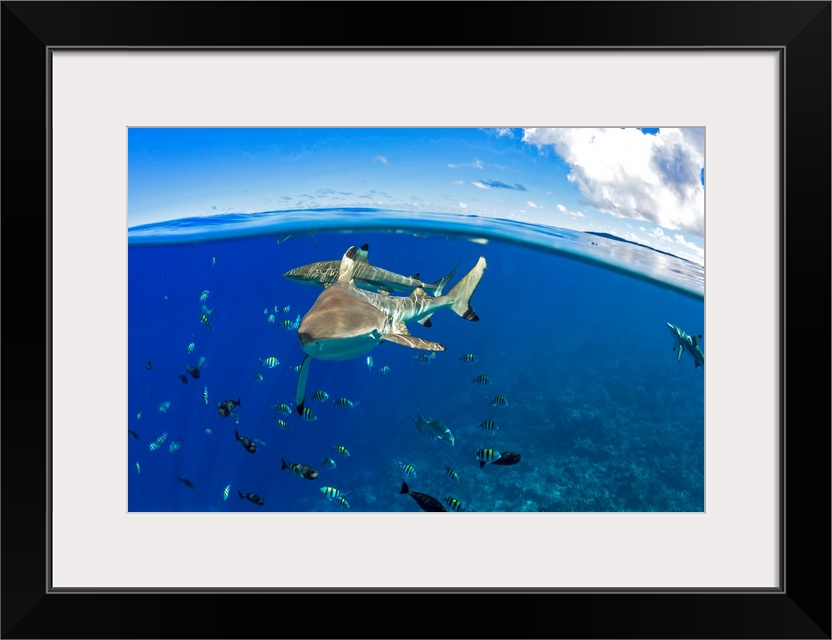 <p>Blacktip reef sharks (Carcharhinus melanopterus) just below the surface off the island of Yap; Yap, Micronesia</p>